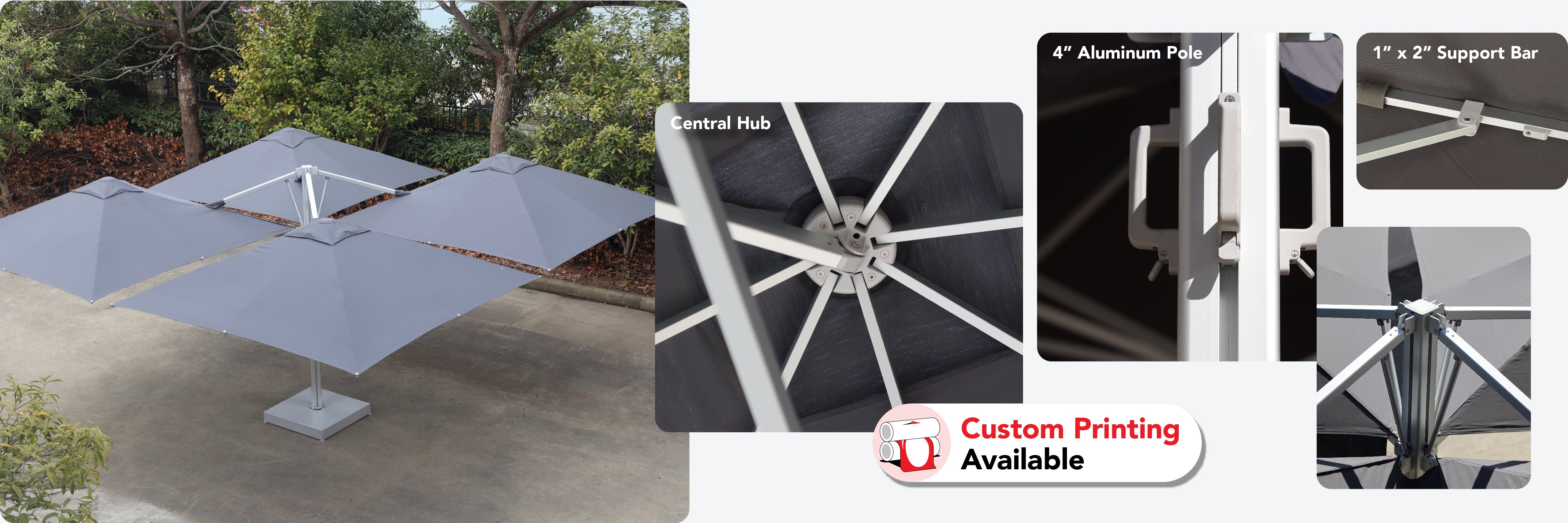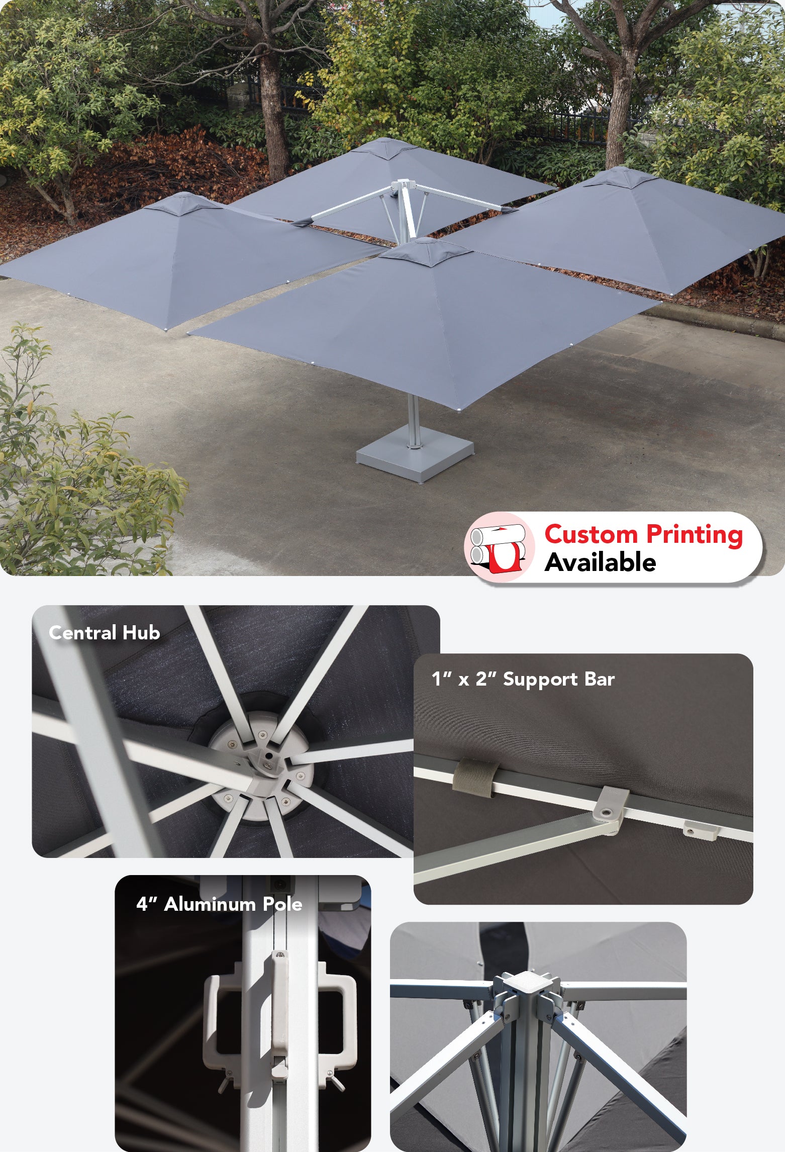 Discover the Multi Shade Pod Cantilever Umbrella — a sleek, side-post shade solution crafted with a robust 4″ aluminum frame and premium 260gsm acrylic roof fabric. With pod configurations for 1–4 roof panels and a full spectrum of colors, it brings standout style and serious coverage to your space.