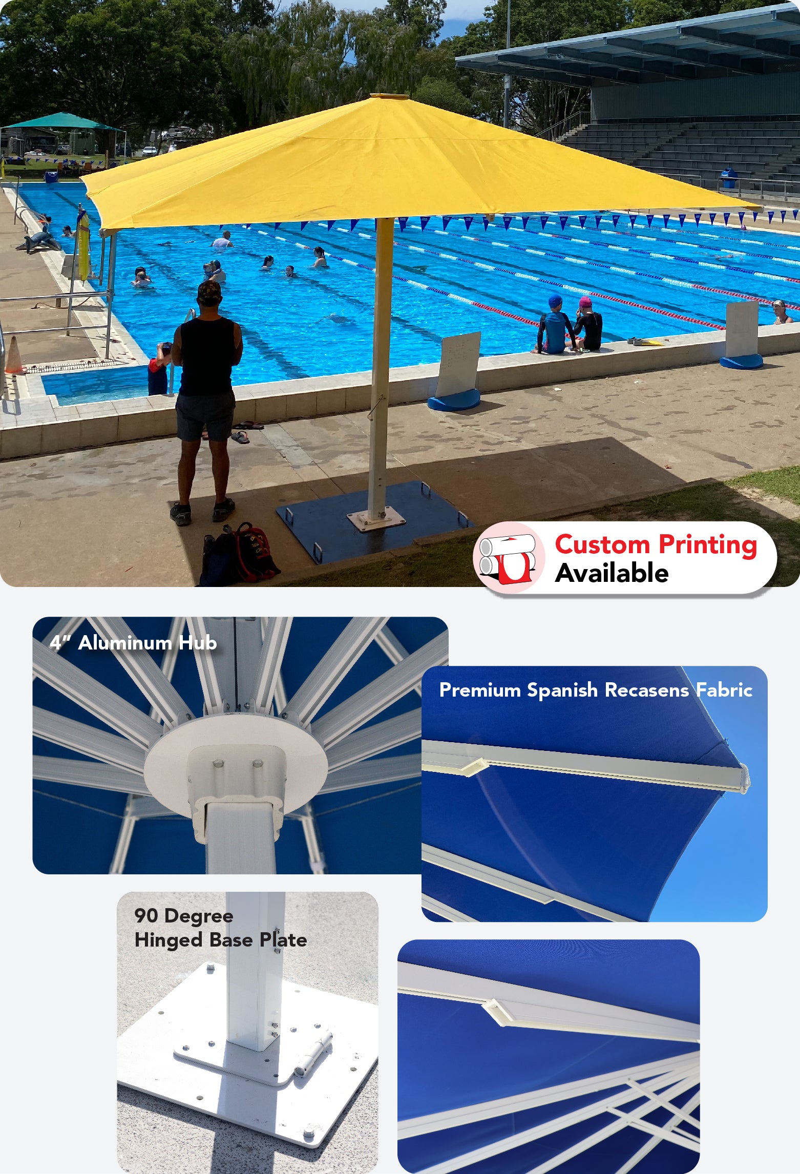 The Spanish 100 Series Square Umbrella blends European elegance with commercial-grade durability. Built with a 4″ diameter aluminum pole, 800gsm weather-resistant roof textile, and 90° hinged base plate, it delivers reliable outdoor shade for upscale patios, resorts and restaurants.
