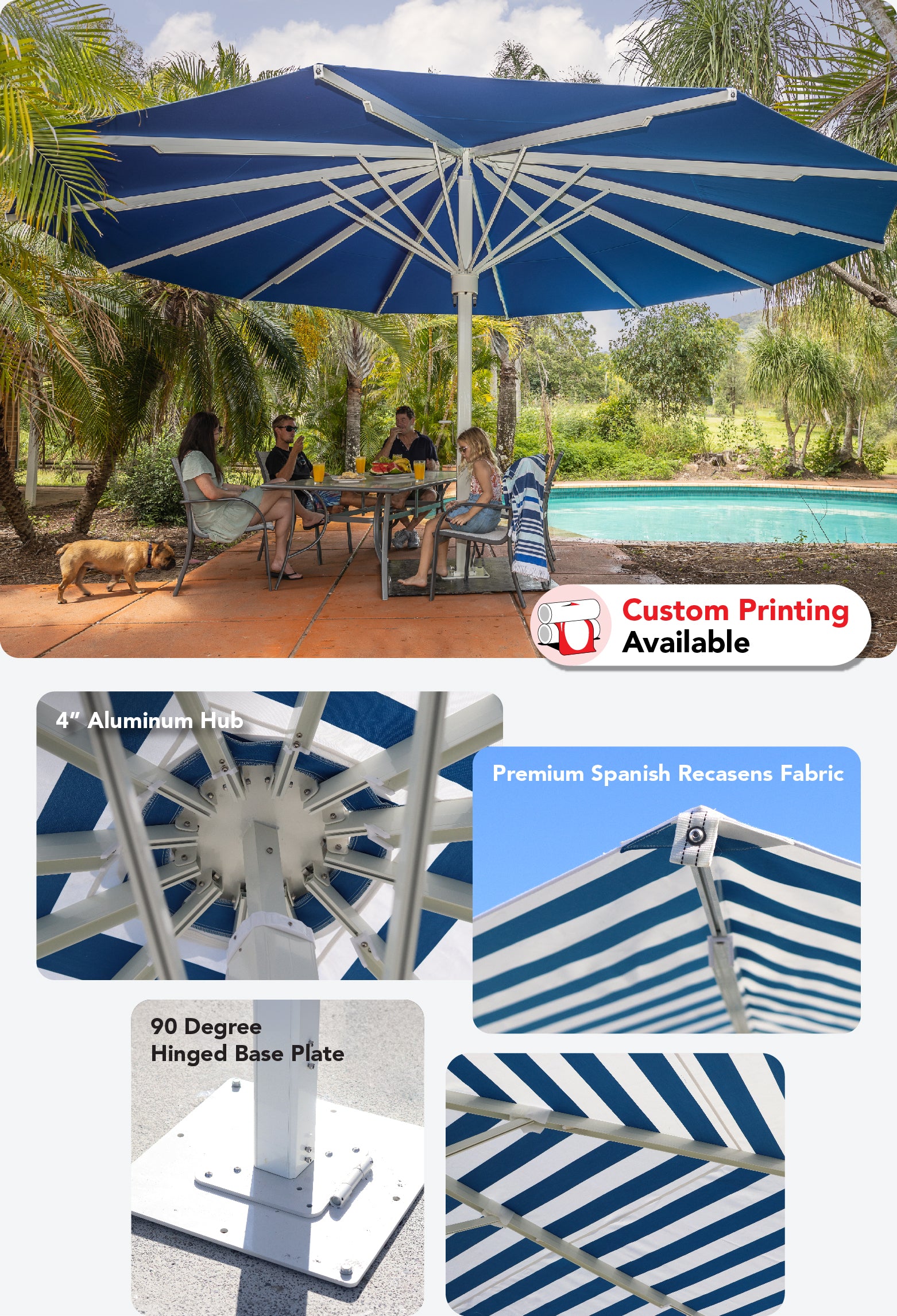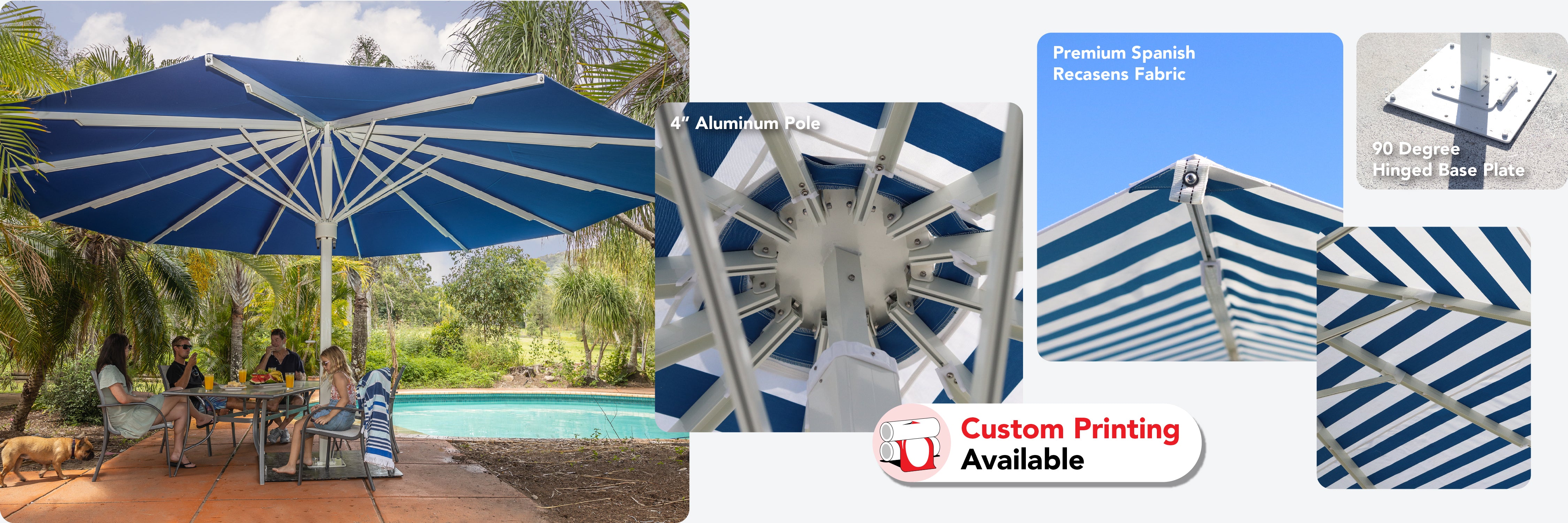 The Spanish 200 Series Umbrella delivers high-end outdoor shading with a heavy-duty 4" diameter aluminum pole, 800gsm weather-resistant roof textile, and 90° hinged base plate. Ideal for upscale patios, cafes or resorts, it combines elegance and durability to elevate any outdoor setting.