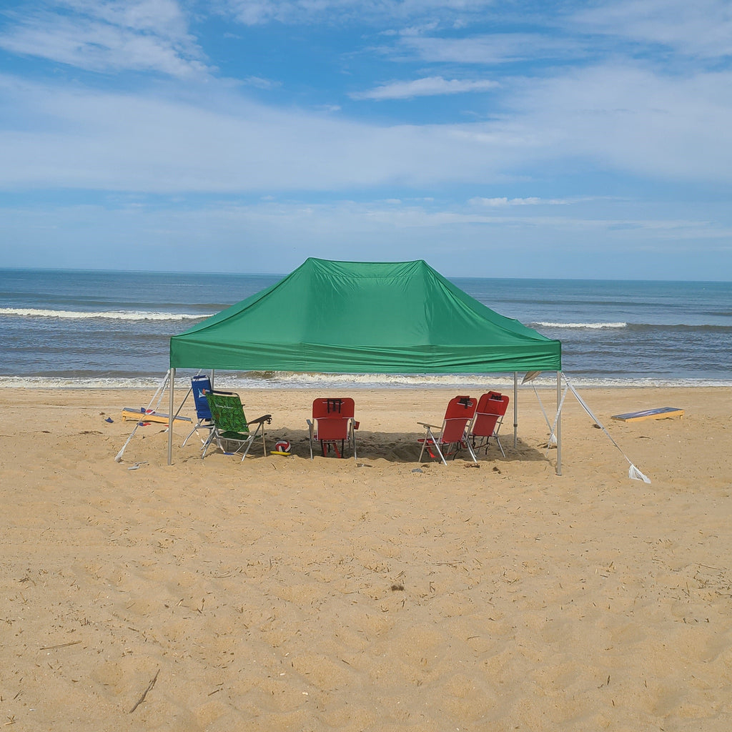 Package Includes: Canopy Frame, Polyester Roof Fabric, Carry Bag, Tie Down Ropes, and Steel Pins.