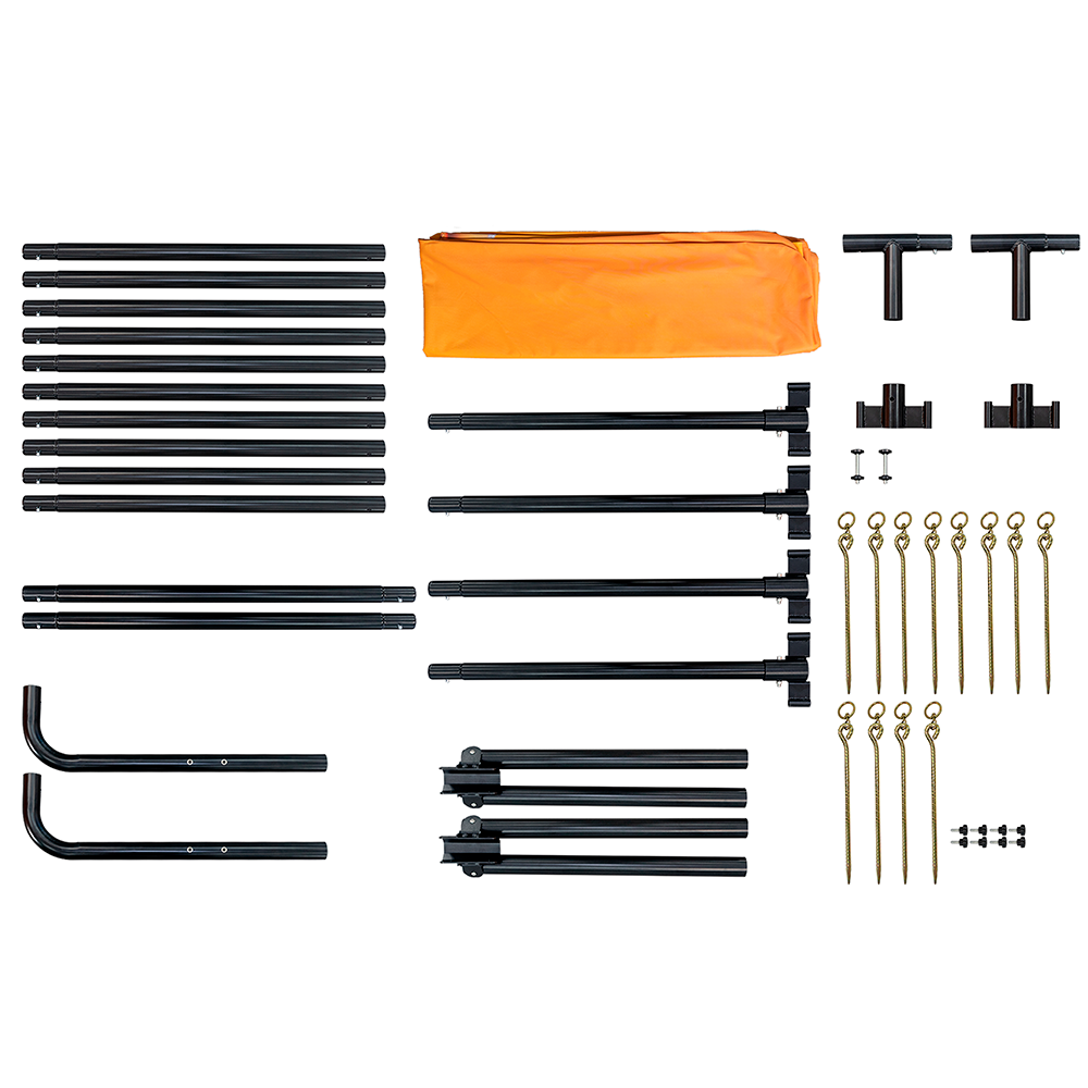 Package Includes: 280GSM Polyester Stretch Fabric with Zips (Double Sided Print), Black Frame, and Ground Spikes.